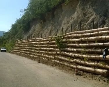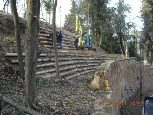 La palificata loricata utilizza tronchi di legno per creare stabilità e rinforzare il paesaggio, integrando vegetazione e terreno nella sua struttura per una migliore resistenza agli agenti atmosferici.